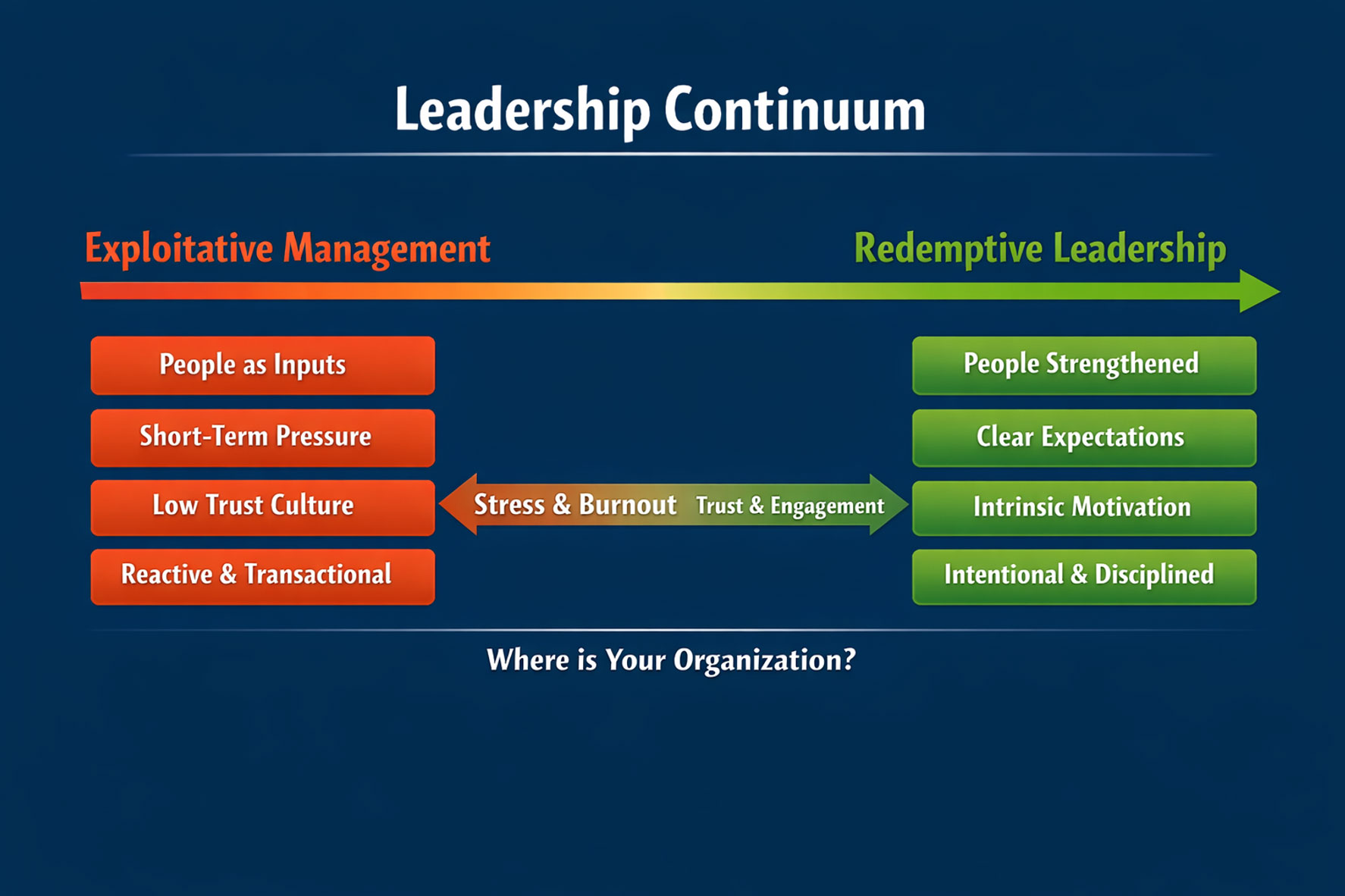 At the other lies redemptive leadership, where individuals grow stronger through their work while still being accountable for meaningful performance.